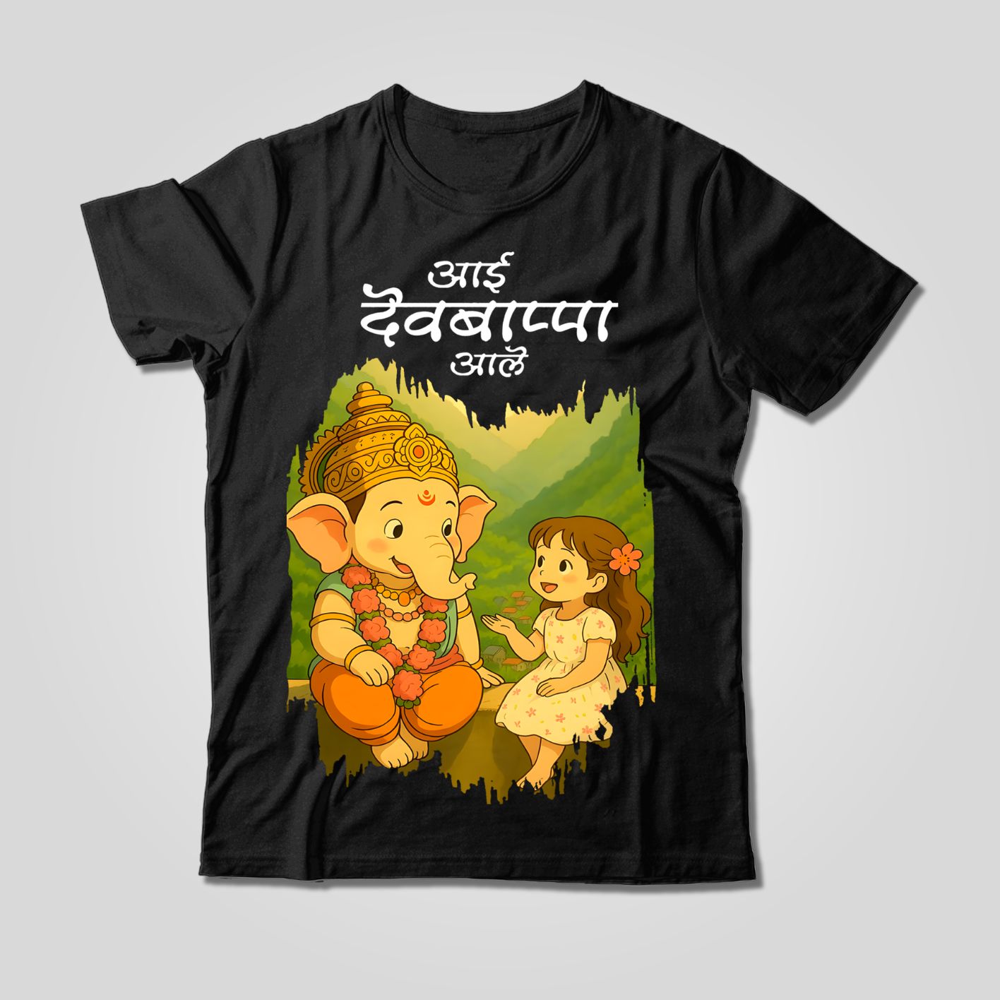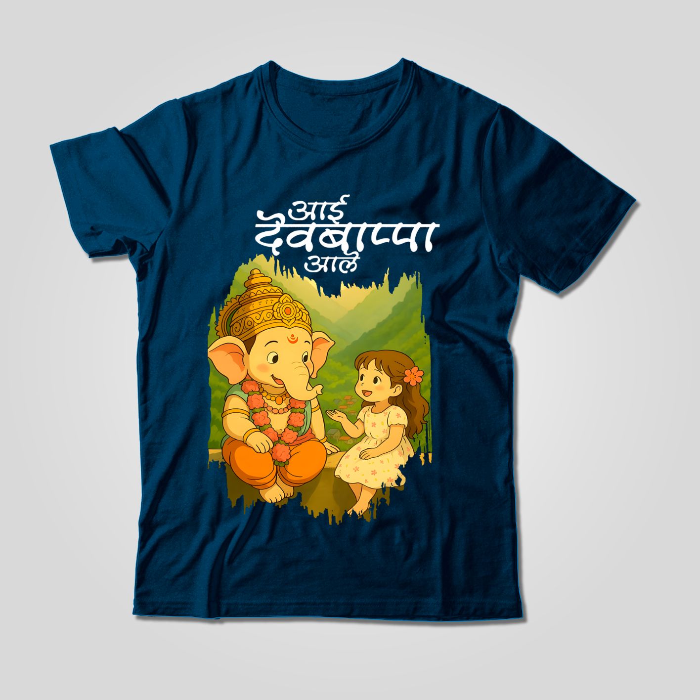 Bring stories to life with this adorable tee showing a cute cartoon Lord Ganesha and a cheerful little girl, complemented by the Marathi text “आई देवबाप्पा आले” (“Mother, Lord Ganesha has arrived”). Bright, colorful, and perfect for Ganpati festival or as a special everyday favorite.